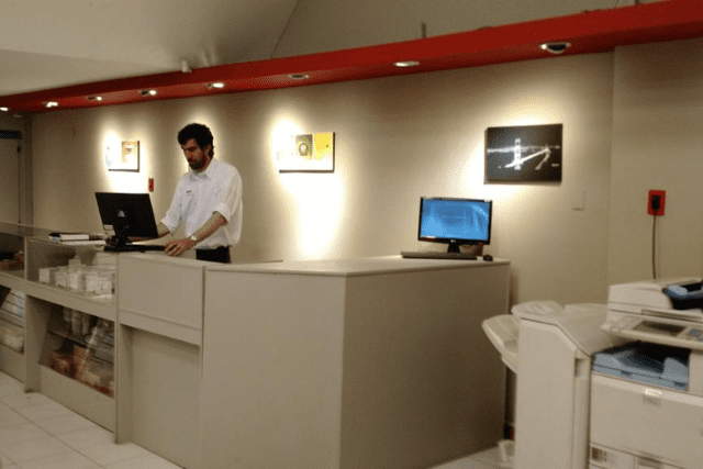 Se conjugaron colores intensos rojos en sectores, en relación con lámparas colgantes de tela miamos rojos, los muros y maderas paneles canalados de exhibición cartelera de información, relajando la visual con grises suaves dando modernismo y pureza a sus ambientes.